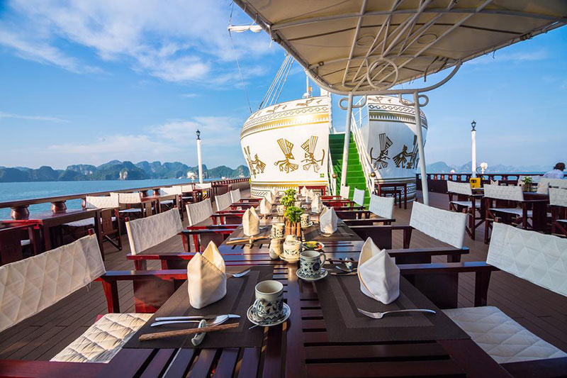 - Dinner on board Guests will enjoy the delicate dinner in the warm and cozy ambience. The freshly cooked seafood dishes, mixed by Vietnamese and Western styles, promise to bring guests an unforgettable dinner on this memorable trip.