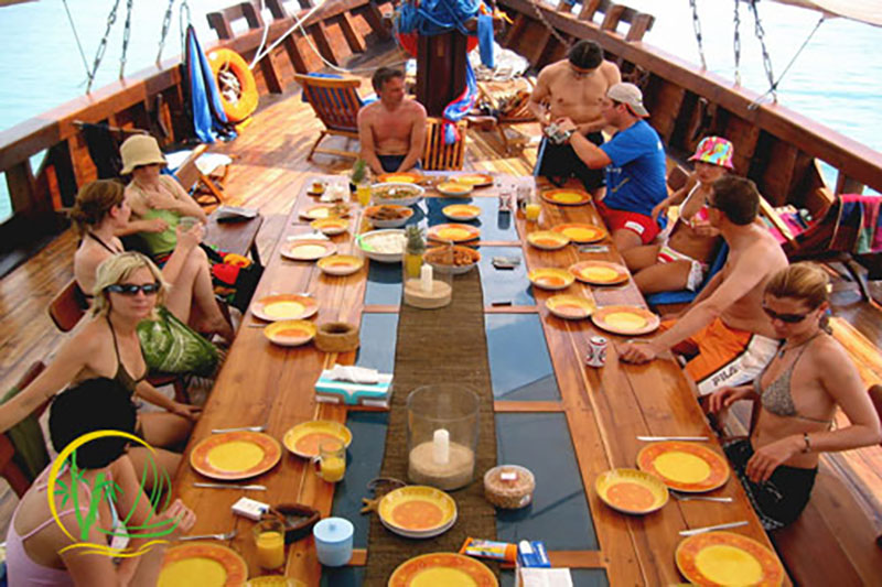 - The crew serves dinner while the Bassac is cruising Mang Thit river towards her anchorage point for the night.