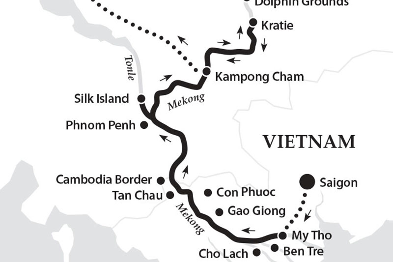 We pass from the vibrant French colonial port of Saigon, through the vast delta so rich in human life and endeavour, to travel along the main channel into the rich countryside of Cambodia…
