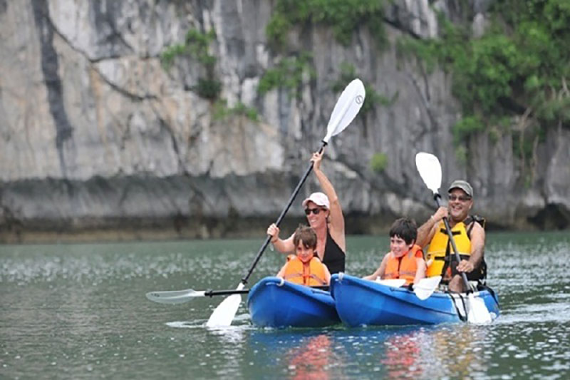 24 hours cruise among magnificent limestone island, islets, hiking to Titop island for great panorama view of Halong Bay, kayaking in tranquil area at floating village, visiting Surprising cave