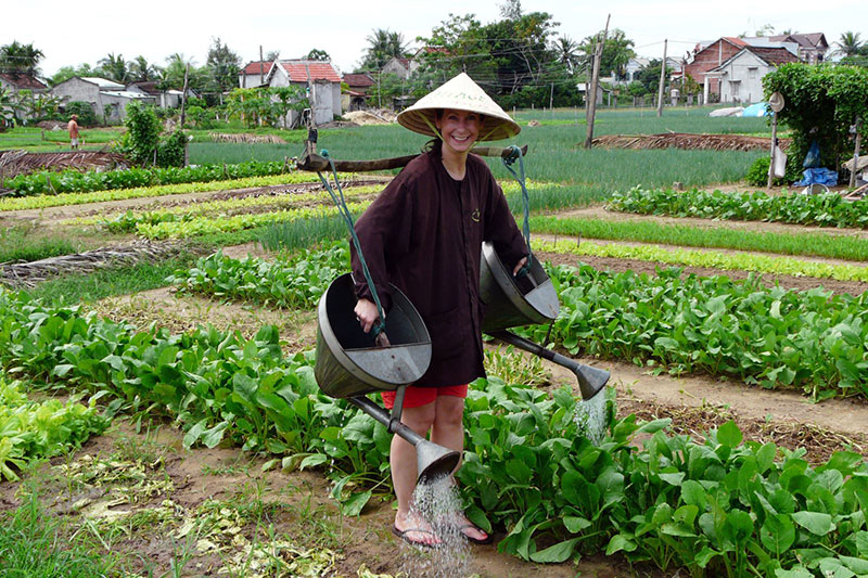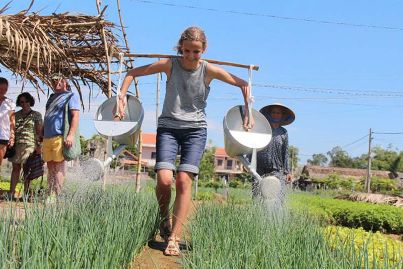 - And then cycle to Tra Que vegetable village. You can relax and enjoy the peaceful countryside then stroll along the vegetable villages. As a special treat, you will be involved with digging, sowing, planting, harvesting the vegetables with hundreds of years rudimentary tools of the farmers. You will enjoy the ‘’E Water’’, a specialty of Tra Que vegetable village, you can feel the strong medicinal flavour from many kinds of vegetables.